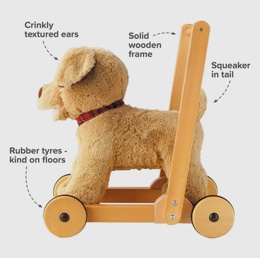 Features & benefits: This fun and friendly push-along toy Labrador features a soft golden plush coat and cute button nose. With a huggable body, crinkles in his ears, and a squeak in his tail, this playful puppy toy is guaranteed to melt the hearts of little boys and girls.
