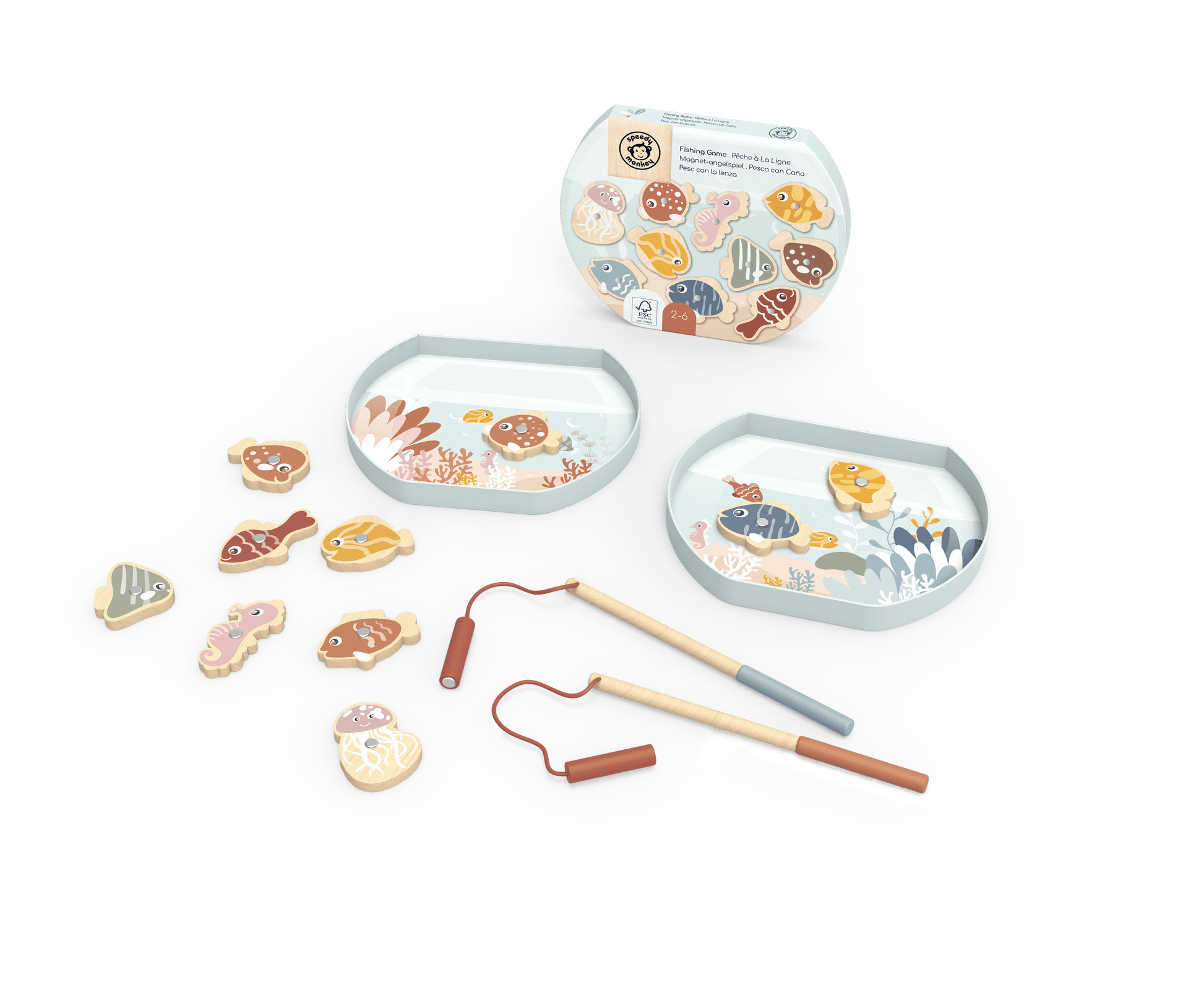 Time to go fishing. Grab your fishing rod for a fun time! These colorful wooden fish can be hooked up by the magnetic rod and once safely attached, lowered back onto the wooden board. Requires skill and concentration to catch each fish.